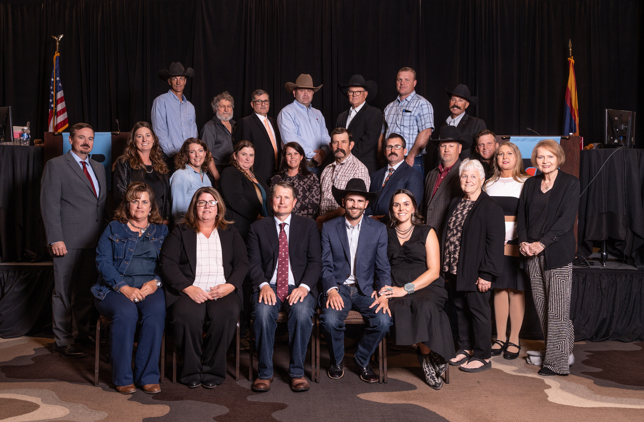 Third row, (left to right): Ty Kelly from Duncan (cattle), Myrle Marlatt from Yuma (produce and seed crops), Marcos Moore from Yuma (agribusiness), Aaron Campa from Golden Valley (cattle), Benny Aja from Williams (cattle), Jordan John from Buckeye (crops), and Richie Kennedy from Casa Grande (livestock).