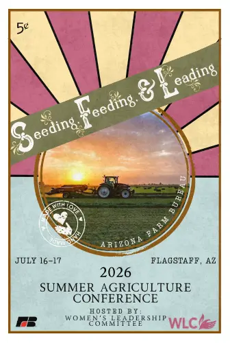 Join us July 16–17 at the Little America Hotel in Flagstaff for the Summer Agricultural Conference, hosted by the Women’s Leadership Committee. Centered around the theme “Seeding, Feeding, and Leading,” this event will feature keynote speaker Sierra Anthony and other inspiring voices from across Arizona’s agricultural community and beyond!